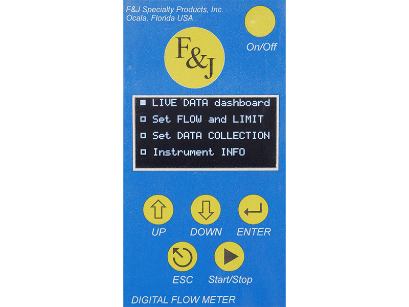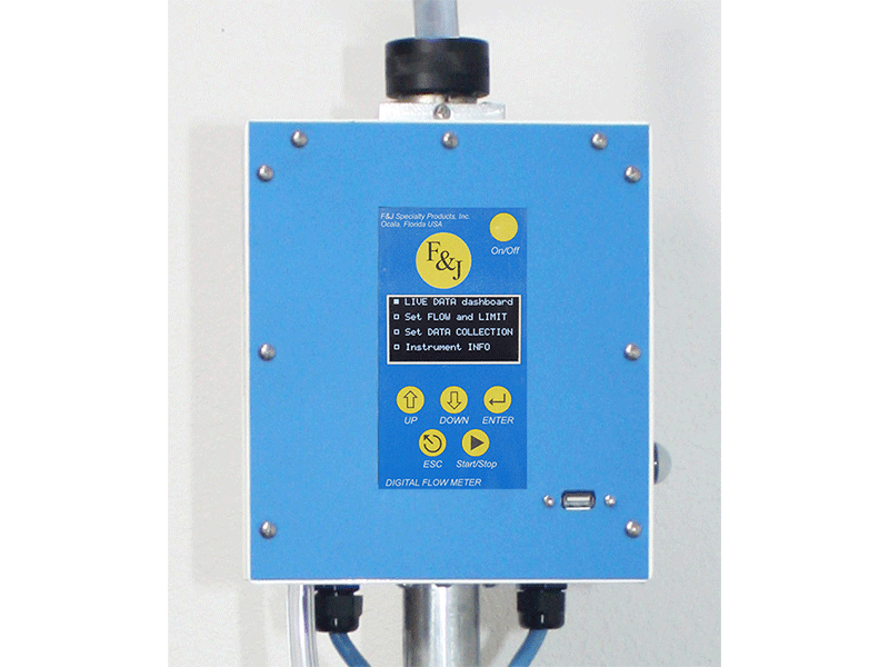 The Model DF-14M-2G cart mounted mobile low volume air sampler with digital flow meter has an adjustable, aluminum sampling gooseneck. The adjustable gooseneck permits sampling at heights varying from 4’ to 7’ above floor level. Model DF-14M-2G contains state of the art microprocessor electronics, which provides for corrected flow rate measurements, volume totalizations, and a USB communications port. It has a large bright OLED display.