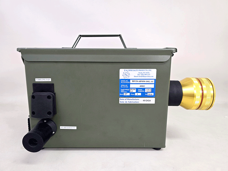 F&J Model DFCP-ABM50-75L-30Li is a military grade lightweight, small footprint, AC/DC voltage pow-ered air sampling system operable from (1) line power, (2) an on-board 30 Ah LiFe(PO4) battery, (3) an external 12-15 VDC power source, or (4) from the F&J LIBATBANK-12V external DC power source.